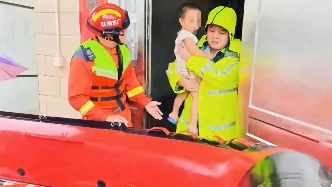 8月4日,惠州惠东县,特警队员在暴雨洪水中救出一“盆”宝宝。